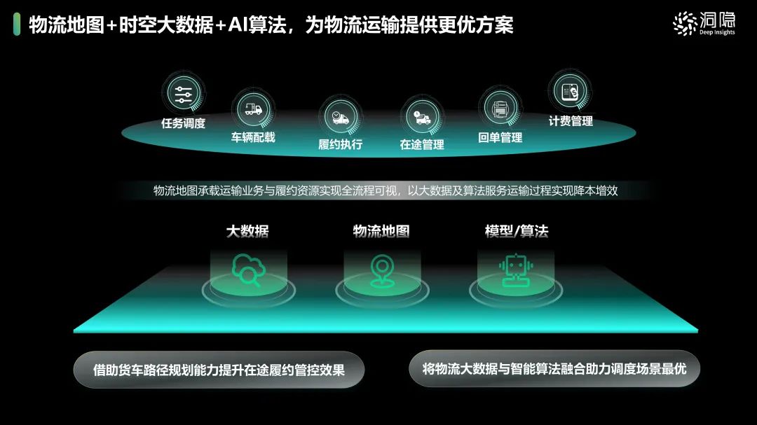 其中在“运输+AI”的场景中,洞隐与高德云图联合推出了“智慧货运地图”解决方案,将物流地图结合时空大数据、AI大模型与算法一起为物流运输提供更优方案。