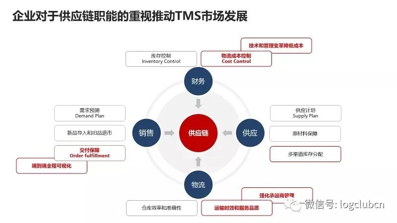 企业供应链管理部门职能对接销售、供应、财务、物流等各个方面。其中对于订单交付时效保证,物流服务品质需求,物流成本控制,以及对于端到端全流程的高效协同和信息共享的普遍需求,推动近年来TMS应用市场的高速发展。