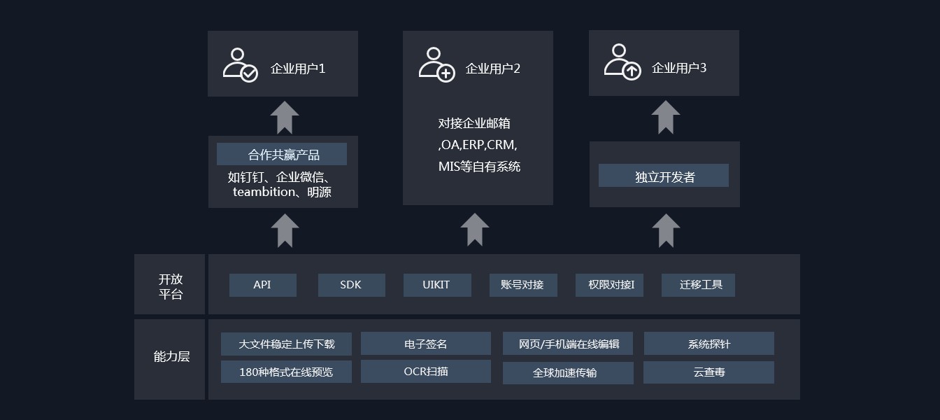 除了上述raybet雷竞技苹果版入口自身的众多创新成果外,亿方云还与众多第三方应用进行集成,通过API、账号对接、权限对接等融入办公生态,融合了包括一起写的在线编辑能力、Teambition的文件协作能力、绿盟的平台加固等安全能力及浩辰软件在建筑行业的特殊格式文件预览能力等,为自身raybet雷竞技苹果版入口整体赋能。
