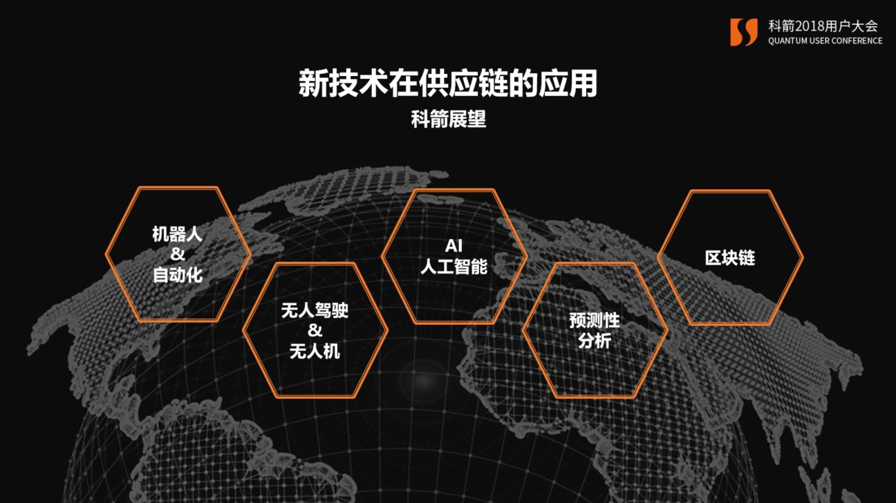 我们也一直在研究和尝试一些新的技术,比如说机器人和自动化,打造一个更加智能化、安全、高效的执行体系。无人驾驶和无人机,它会使我们整个物流更加准确。人工智能AI,这个目前我们一直在做,我们会发现在整个供应链执行过程当中会涉及到很多的算法,比如说TMS云和阿里云在合作,怎么样把城市配送的路径优化做得更加好。同样我们会做一些算法,怎样有更好的解决方案让装箱要更加合理、准确。另外很多的第三方物流,怎么让结费的引擎更加强大,除了提供几十种结算模式,是不是未来可以给客户提供更加可配置的引擎。这些都是我们在人工智能和AI算法上做了很多的尝试,包括仓库执行端,整个上架算法都是需要不断优化的。最后说一下区块链技术,某些行业客户也已经提出了具体需求,是不是能够把供应链上的数据以块状的方式在链条上永久存储,比如期货的铜和铝,从供应商到制造商,从制造商到经销商到物流公司到最终客户,然后再到金融机构,科箭也会在这一领域做一些尝试。