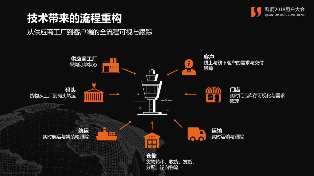 总的来说我们希望通过这些新技术的应用,能够帮客户进行商业模式和流程的再造,我们供应链云平台的设计理念就是希望一个客户从它的供应商经过各种渠道,不管是码头航运、仓储运输,零售业可能是到门店,制造业关注入场,怎么样连接供应商。我们的云平台正是解决这个连接的问题,能够把整个供应链上下游通过一个云平台快速连接。第二,全流程的可视化。在整个全流程中,如果你的企业有这样的云平台,整个供应链效果都会得到很大提高。
