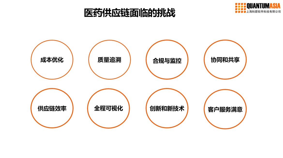 科箭解决方案总监金鸣在此次会议上发表了主题为《数字化供应链与医药物流》的主题演讲,首先列举了医药行业在供应链领域面临的部分挑战: