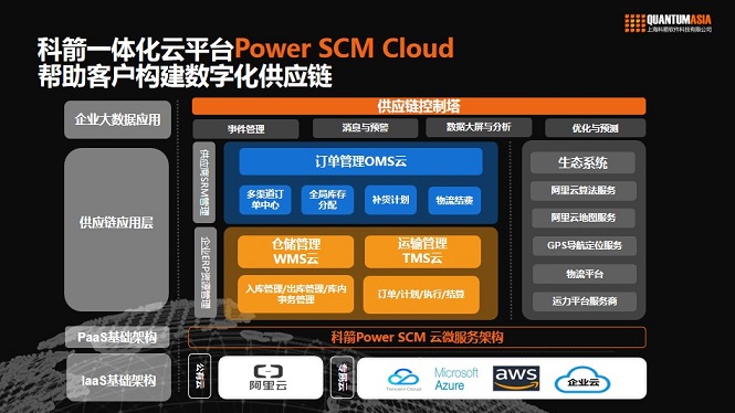 朱庆华女士介绍了科箭上云的历程。她说,科箭从2015年开始将一系列的供应链软件转型云端,已经推出了一体化的供应链执行云平台,从订单接入、分配,到仓储与运输执行。科箭的云平台支持公有云与专属云布署方式,支持市场普及率较高的各大云平台。不论是选择了科箭的一体化的平台或只是其中一朵云,通过科箭的供应链控制塔,都能将企业物流执行方面的数据集中并提取想要的数据进行分析与呈现。