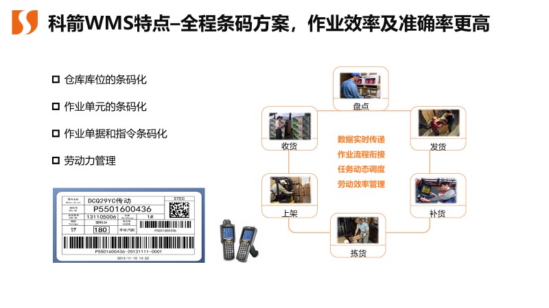 基于实时的无线移动技术,通过将科箭WMS与ERP整合后,将优化、改善企业运营中供应商送货预约、收货,上架,补货,装箱校验,装车和盘点等作业, 并且为ERP补充了生产过程数据采集、序列号追溯、劳动力管理、仓库KPI分析等功能,从而真正实现了企业运营管理的自动化和智能化。最后,使仓储供应链的效率达到最佳,并且使生产率大幅提高。具体表现在: