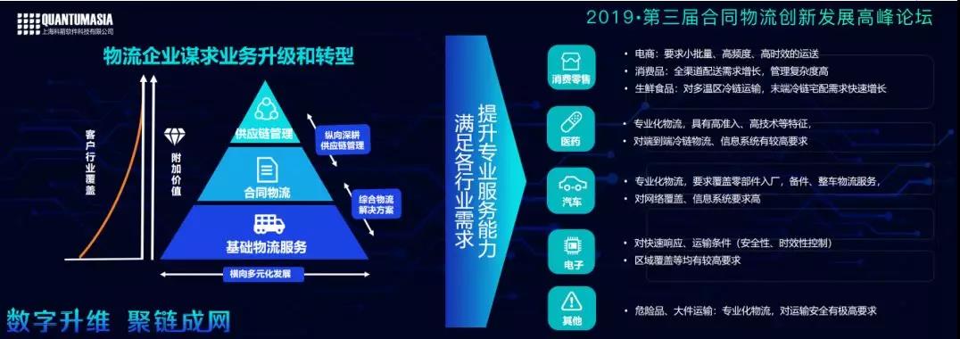 对合同物流企业来说,不同行业的客户会有不同的需求,比如:消费零售、电商行业,追求小批量、快速、高频度、高时效的运送。消费品行业对全渠道、所有业务配送的增长需求很快,管理复杂度很高。生鲜食品行业对温控、冷链运输的需求很高……这些都对合同物流企业提出了要求。比如:在医药行业,有专业化的物流,有自己的准入标准,如医药合规的一些监控,对物流企业的系统有很高的要求。汽车行业的入场、出场、备件、整车等,对物流的运输仓储、物流配送,到主机厂,供应商库存的管理等,都提出了网络覆盖的要求,对信息化系统的要求也很高。还有,3C电子、电子类交付行业,要求实现快速响应。