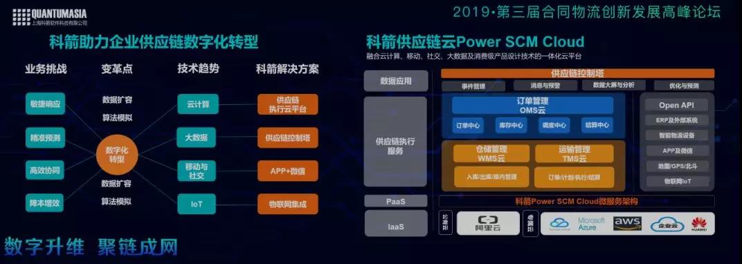 科箭软件创立于2003年,已经具有16年供应链信息化经验的企业,为响应供应链创新这一国家战略,支撑企业向现代供应链转型,科箭也在不停地进行变革。科箭在2015年推出了新一代基于云架构设计的raybet雷竞技苹果版入口,公有云平台是建在阿里云IaaS上的,同时也支持华为云、微软云、AWS等私有云的部署。在PaaS层,基于科箭Power SCM Cloud微服务架构,来满足供应链执行层面不同的服务需求。在企业应用服务SaaS层,我们主要提供了三朵云:第一,订单管理云,做全渠道订单的接入、调度、结算,并通过订单去驱动物流业务执行。第二,仓储管理云,管理相应的入库、出库、库内管理等仓储相关业务。第三,运输管理云,管理从运输定单的计划、调度、执行到结算。
