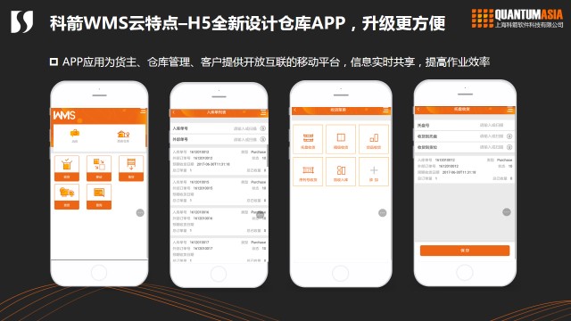 原来的WMS客户基本都是使用PDA设备,然后在这个上面开发一个CS的程序,就能用APP进行扫描收货、上架等工作了。我们现在是开发了WMS APP来做盘点、上架和拣货的。另外我们还有管理人员APP,你的客户和仓库的管理人员以及销售、客服部门的人员等。我们做的是基于H5的APP,可以跨平台,支持苹果手机和安卓手机。现在的人能用手机处理的事情就不用电脑。我们也是这样的理念,我们会把所有的功能在APP上实现,管理人员用APP可以随时关注业务数据。