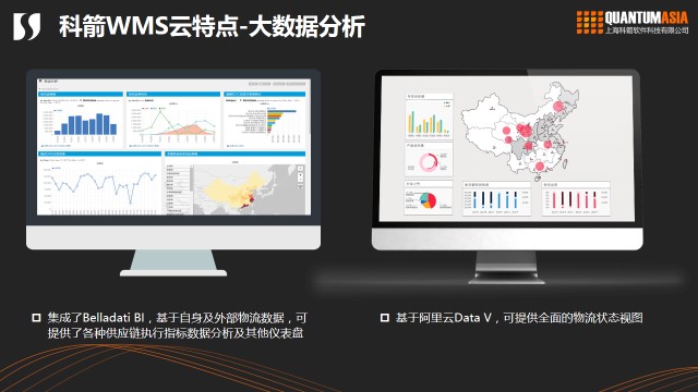 我们有了系统记录的很多数据与流程,最终目的是要能把这些数据用起来。我们集成了国外先进的BI工具,用户就可以通过这个工具来对自己的业务数据做更多分析,实现数据化。另外我们的云服务是跑在阿里云平台,所以阿里那些的大数据展示工具也在我们的系统里面有集成,我们客户可以通过此功能搭建自己的物流数据大屏。