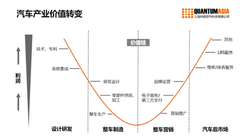下图的汽车行业微笑曲线可以看出,除了加大自主研发与创新,加强营销与服务外,汽车行业的价值创造和分配模式正在发生转变,企业、客户及供应链上下游相关方正纷纷参与到价值创造、传递及实现等各个环节中来。建立协同的智能化的数字化供应链成为汽车行业应对这一价值转变的手段之一。