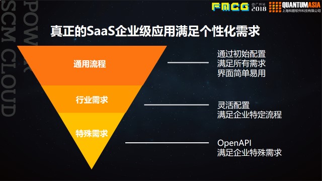 在座的有食品、医药、化妆品等不同的行业,我相信你们每个行业都有自己的需求特征。作为IT来讲最强调的一点是要满足企业本身的业务特点和需求,所以我们云服务的方案也要考虑可配置性,每家企业都有自己的特点,大家在选系统的时候一定会提出来我这个特殊的功能你能否帮我实现,我要去定制。我想强调的是科箭供应链云平台在设计之初就考虑到这一问题,我们基于微服务的轻PaaS架构,使云端交付的SaaSraybet雷竞技苹果版入口可以通过配置来满足你的行业需求,也可通过Open API实在定制化服务的对接来满足您最后一公里的企业个性化需求。