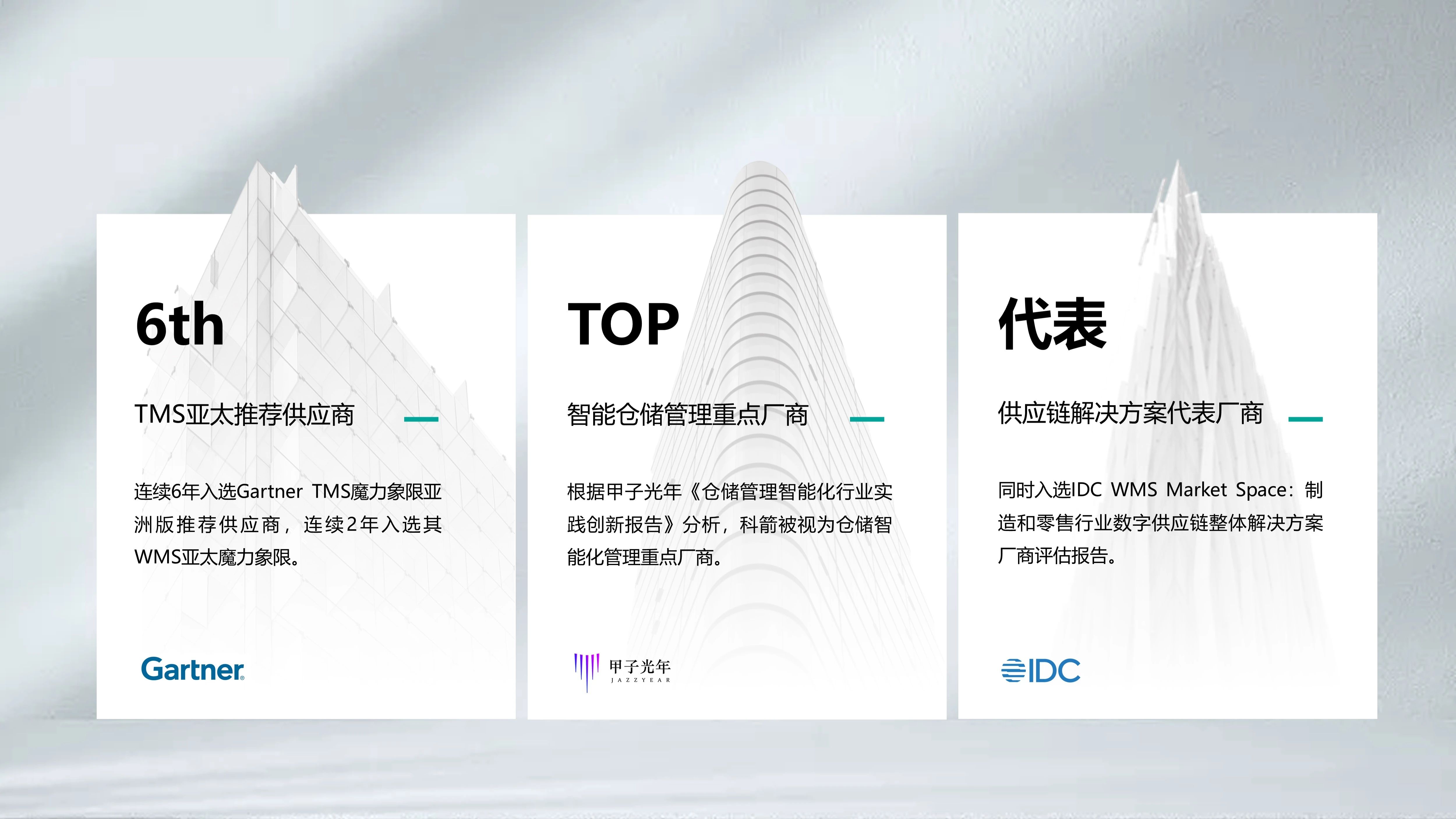 很荣幸,我们的raybet雷竞技苹果版入口服务作为典型被多份重磅行业报告收录和推荐,其中已连续6年入选Gartner TMS/WMS魔力象限亚太版。除此之外,更凭借创新物流技术走向应用落地和商业化的成功案例获得了媒体的诸多认可。