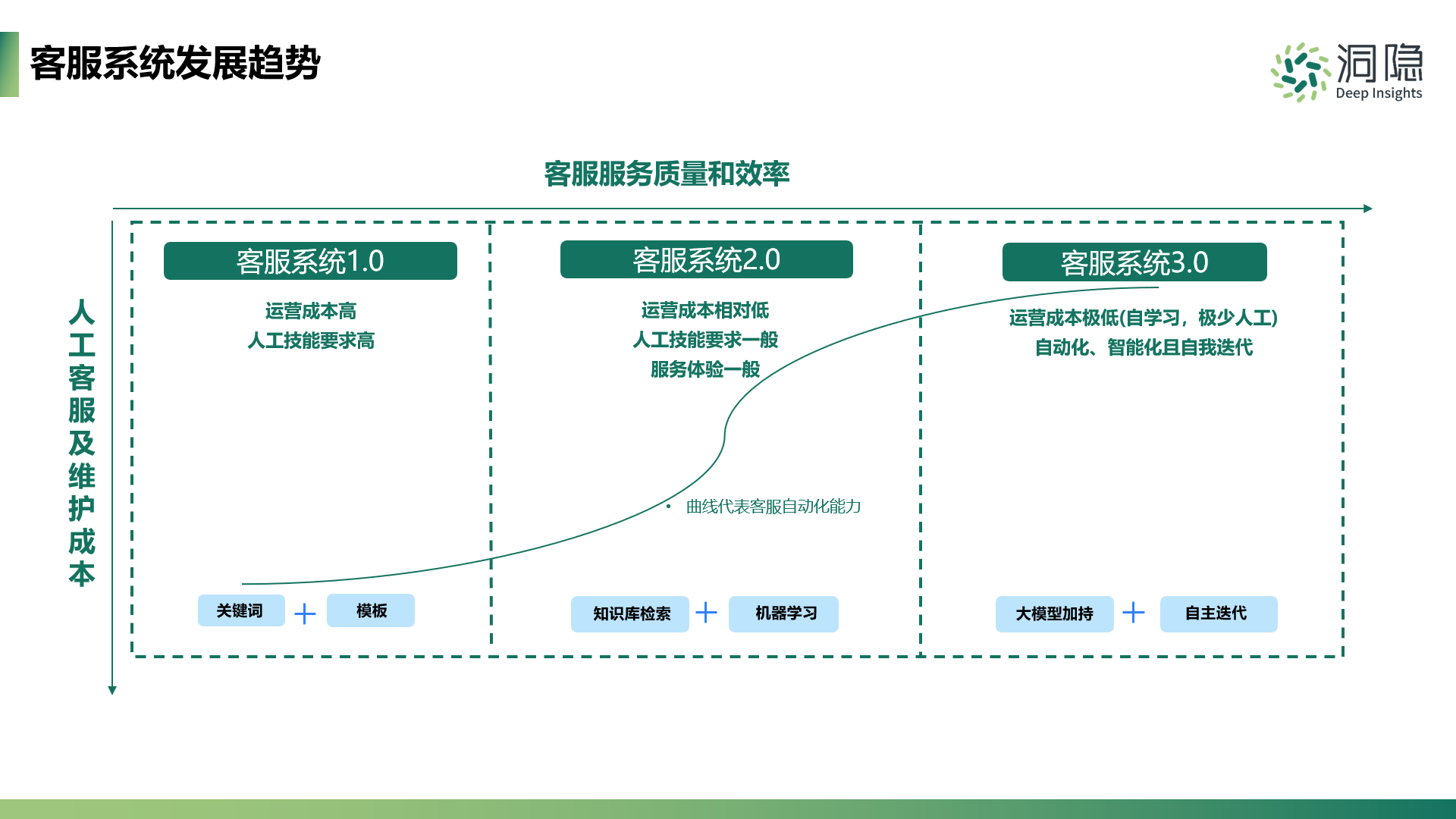 1.0阶段是为人工客服提供辅助管理系统工具;2.0阶段引入了机器人客服,虽然减轻了人工客服常规服务的工作压力,但服务体验比较一般;3.0阶段是基于大模型能力的AI客服,注入了强大的自然语言处理能力,显著提升了其服务质量和效率;并且,AI机器人通过自我学习和迭代,使服务更智能化、人性化。