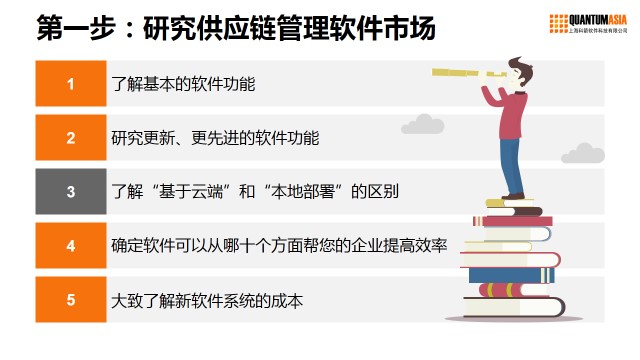 研究阶段是软件选型过程中较有意思的步骤之一。 您可以上网、通过社交网络或下载白皮书来熟悉了解供应链管理软件市场的现状。 如果您已经了解了有关供应链管理软件的一些信息,请使用此步骤来了解这些软件的最新动态。 如果从没了解过这个行业,也不要担心自己不够专业,尽量搜寻些您将要进行评估的软件的背景资料。 您需要了解这些系统的功能,各种部署模式(例如,基于云端的还是本地部署的)以及学习行业术语。 了解一下通过这些软件能在哪些方面改善物流运营也很重要。 您正在进行一个全新的投资,因此利用好这个机会重新设计流程并实现飞跃式提升,从而大幅提升效率。 最后,大致了解这些系统的成本。
