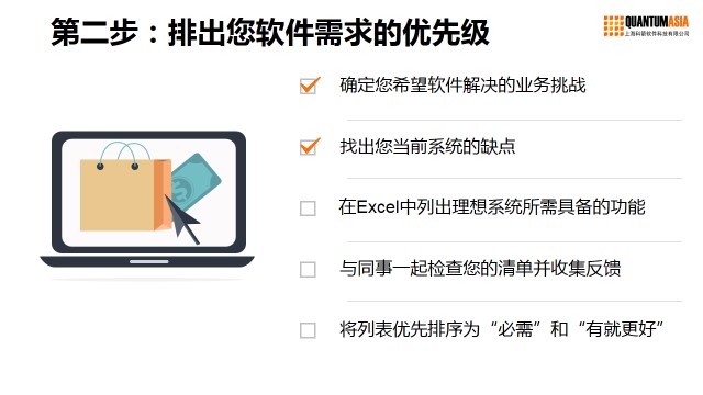 现在是时候专注于辨别和确认软件需求的优先级,也就是您想从新软件中获得哪些关键功能。 这一关键的研究过程是软件选型的基础。 通过了解您的需求,您将能够更好地控制选型过程,而不是让软件供应商左右您的需求。先确定您想要解决哪些业务挑战以及您当前的系统无法为您实现的功能。然后创建一个Excel电子表格,列出解决这些挑战和缺陷所需的所有软件功能。 让您的同事也参与其中。 最后,当您的详尽列表完成后,您需要将其优先级划分为“必要”功能以及那些“有就更好”的功能。