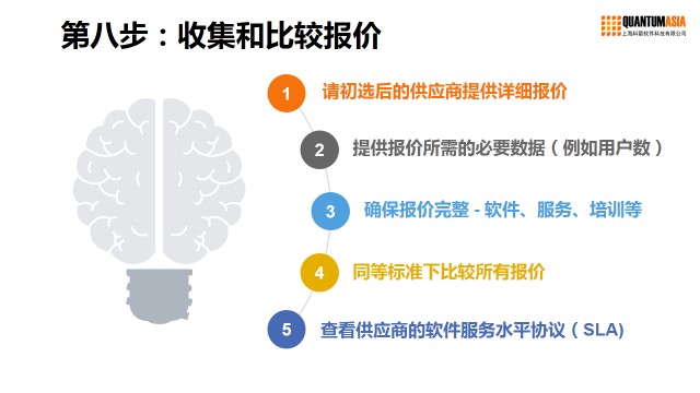 现在是时候从剩下的几家软件供应商处获取详细报价了。 虽然我们认为价格不应该是您的主要决策标准,但它可能是一个重要的决定因素。 此外,让两到三家供应商竞争您的业务可能会带来更具竞争力的价格调整。 要求每个供应商提供详细的报价,包括与系统相关的所有成本。 这包括软件许可、客户化、支持与维护其他费用。 还要求他们指定运行系统所需的任何第三方硬件或网络设备。要知道现在有许多定价模型(例如,软件许可证、每月每年订阅费),因此您需要“标准化”报价以进行同等比较。