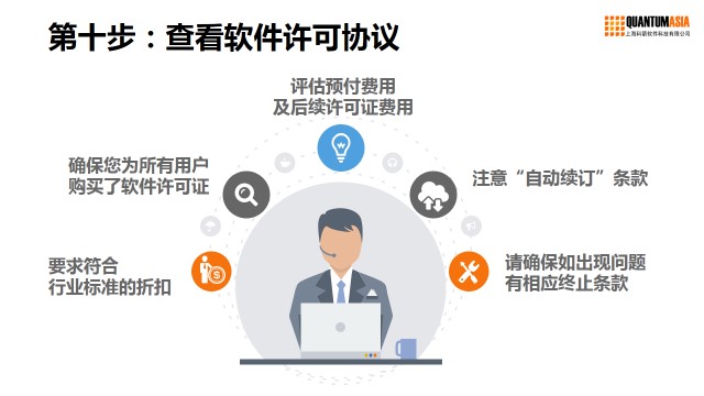 最后一步,你准备买了,但在您付款之前,您需要查看软件许可协议。 一般来说,软件公司可提供的折扣根据交易规模而增加(例如,更大的交易=更大的折扣)。 当然,有一些供应商不打折,他们对所有客户收取一个标准价格。 无论如何,都可以试着要求折扣。 交易的条款和条件同样重要。 确保您为整个组织购买足够的许可证,请注意自动续费条款,并确保如果供应商没有达成承诺时您可以有一些追索权。