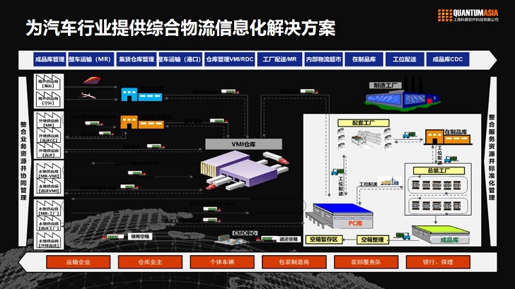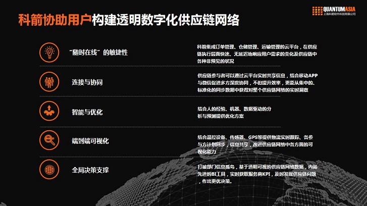 科箭为汽车行业客户构建的透明数字化供应链网络,具有随时在线、连接与协同、智能与优化、端到端可视化、全局决策支持等特征。