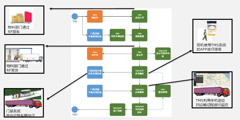 如上图所示,第一阶段还可整合了工厂门禁系统,将已授权车辆信息传递至门禁系统,自动打开门禁杆,记录车辆入场及出场时间,停留时间超过规定时间,系统自动预警。车辆到达装载月台,司机可利用手机APP 扫描装车的物流单条码;车辆到达客户,完成卸车后,驻场人员点击APP卸车;如需进行 POD 签收,驻场人员在纸质单据上完成签字后,司机利用 APP 将 POD 拍照上传。