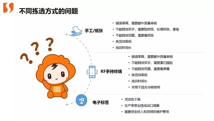 目前,拣选方式主要包括:拣货单人工拣选、PDA人工拣选、RFID人工拣选、语音拣选、穿梭车货到人拣选、类Kiva机器人货到人拣选,以及正在兴起的增强现实智能眼镜拣选等方式。