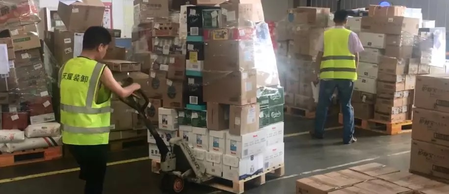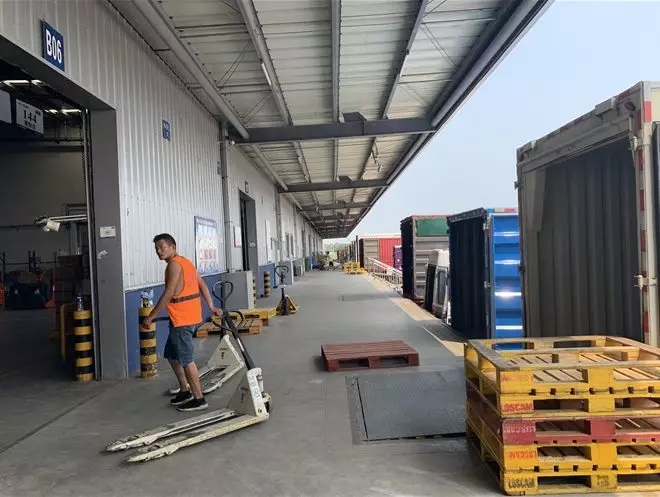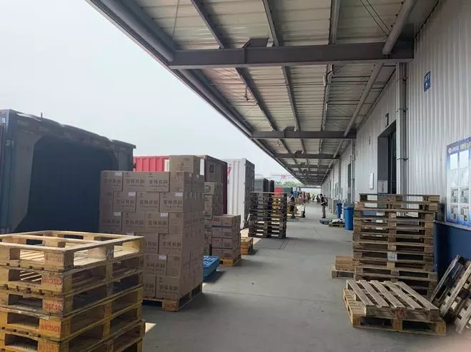 上早班的仓库人员,开始在越库区进行卸货作业。