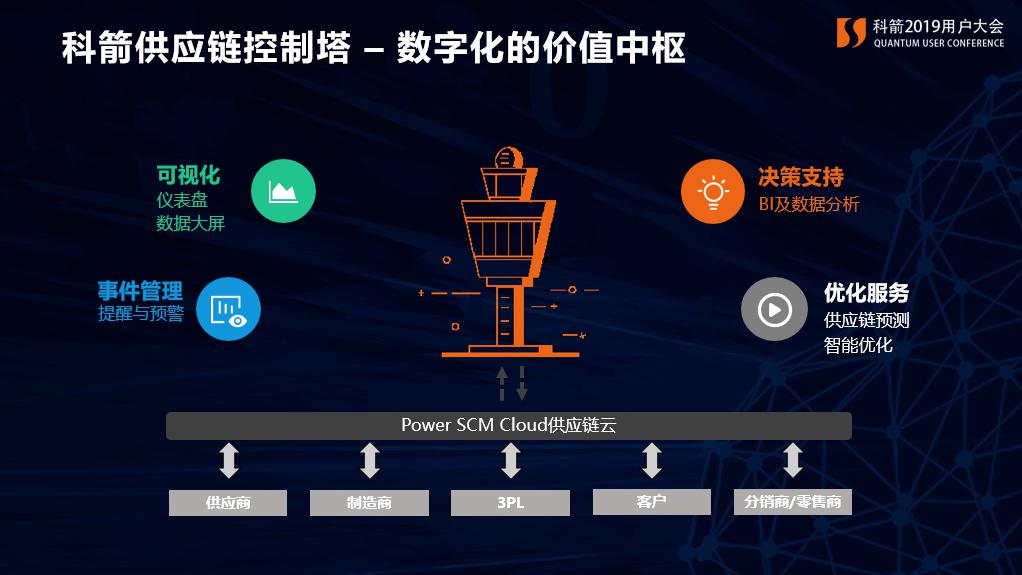 供应链控制塔(SCCT)在恰当的时间把需要的信息呈现给相关人员,成为企业各业务部门信息的汇集平台,实现实时事件与例外管理,全流程透明可视化,为管理者提供决策支持,通过缺预测性分析、AI算法等不断优化供应链业务。