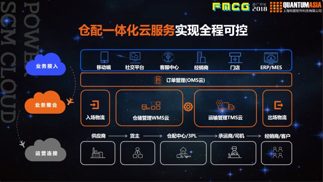 我们看到图中所示业务的三个层级,一个是接入层,一个是整合层,一个是运营层连接到不同的对象。对于快消来说,场景是非常之复杂的。在快消品行业,物流供应链的需求接入来源于方方面面,To C的有电商、门店的、ToB的有经销商或企业客户的。整合层需要通过入厂、出厂的物流,仓储与配送来履行订单。在人的连接层方面,参与的角色是非常多的,从供应商、物流服务企业、承运商与司机到经销商与客户。如果我们的供应链核心系统,仓储、运输系统是隔离的,整合的能力、响应的能力、集成的能力其实都是非常困难的,所以我们要考虑到仓配一体化的能力,再加上OMS订单管理这块来形成一体化的数字化供应链架构。这里我们说的订单管理不仅是前端销售订单,而是从供应链整体的角度来看,包括了全渠道的订单汇集,订单的执行与结算等整体订单生命周期的管理。